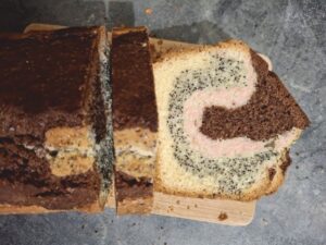Wykonanie: białka jaj oddzielić od żółtek. Mąkę przesiać z proszkiem do pieczenia. Margarynę/masło utrzeć z cukrem na puszystą masę. Nie przerywając ucierania, dodawać po jednym żółtku, na przemian z olejem i mąką z proszkiem. Masa powinna być gładka. Ciasto podzielić na 4 równe części. Białka ubić ze szczyptą soli na sztywną pianę. Podzielić na 4 równe części. Każdą część ciasta wymieszać delikatnie z częścią piany. Do pierwszej części dodać 2 łyżki kakao, do drugiej – ½ szklanki suchego maku, do trzeciej malinowy kisiel, do czwartej – 1 łyżkę mąki. Do wąskiej blachy, wysmarowanej masłem i oprószonej mąką, wylewać ciasto warstwami w kolejności: ciasto białe, makowe, z kisielem, kakaowe. Piec w temperaturze 170˚C przez około 45 minut (do suchego patyczka).