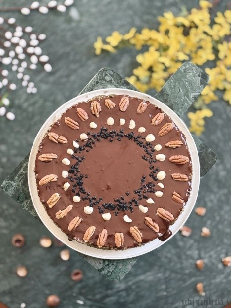 Wykonanie: na patelni lekko uprażyć nasiona słonecznik. Przestudzić i zmiksować z daktylami, by skleić składniki. Tak przygotowaną masą wyłożyć dno tortownicy. Spód daktylowy posmarować kremem pistacjowym. Czekoladę rozpuścić w kąpieli wodnej. Zdjąć rant z formy i polać ciasto rozpuszczoną czekoladą. Dowolnie udekorować. Schłodzić w lodówce do momentu scalenia składników.