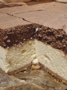 Składniki/masa: 800 g jogurtu greckiego, 5 średnich jajek, 4 łyżki mąki ziemniaczanej, ¾ szklanki drobnego cukru, 60 g masła (składniki w temperaturze pokojowej), herbatniki digestive. Mus czekoladowy: 400 ml schłodzonej śmietany 36%, 200 g gorzkiej czekolady, posiekanej.