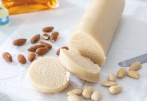 Składniki: 250 g cukru pudru, 250 g mąki migdałowej (nieodtłuszczonej) lub całych migdałów, 50–70 ml likieru Amaretto lub aromatu migdałowego.